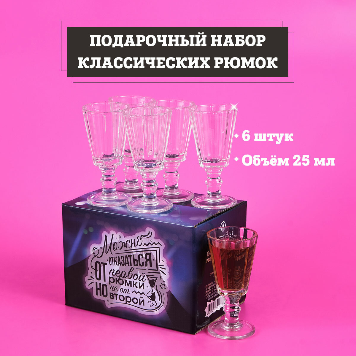 | Комплектация | Подарочная коробка, Рюмка-лафитник граненая 25 мл - 6 штук |