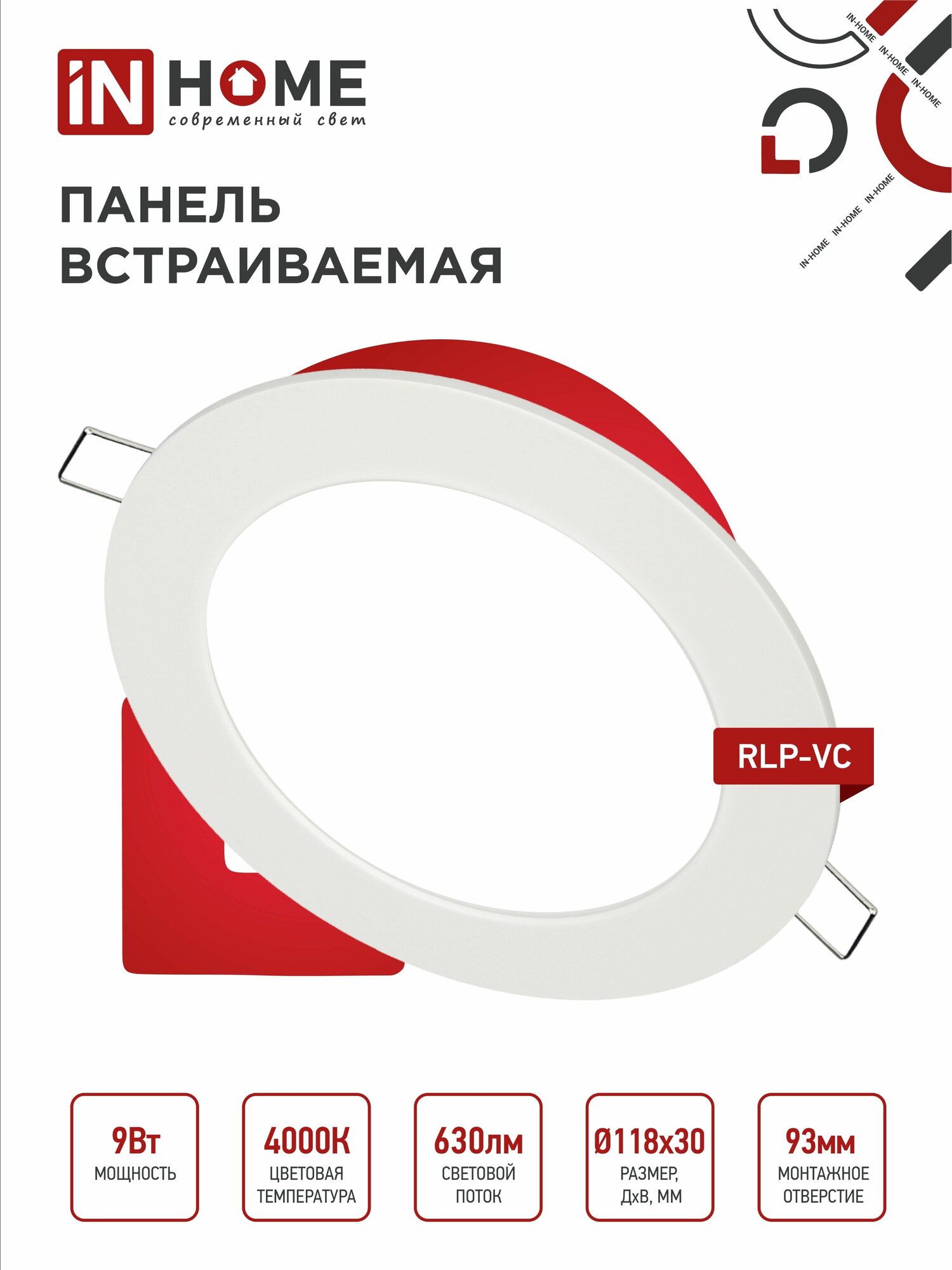 | Дополнительная информация | Светильник встраиваемый In Home RLP-VC 9Вт 230В 4000К 630Лм IP40 118мм белый |