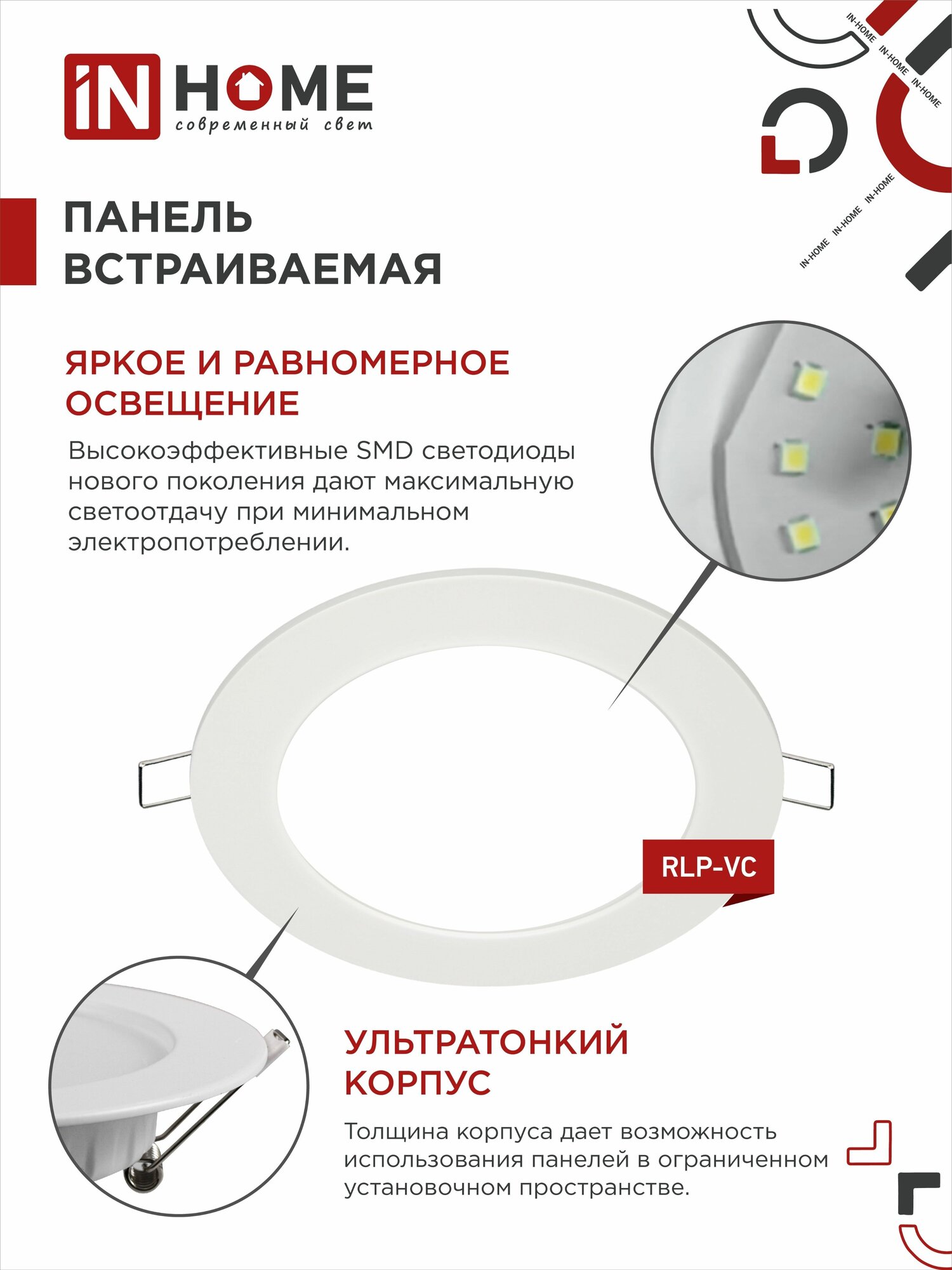 Отзывы на Панель сд встраиваемая круглая RLP-VC 9Вт 230В 4000К 630Лм 118мм белая IP40 IN HOME 4690612023359