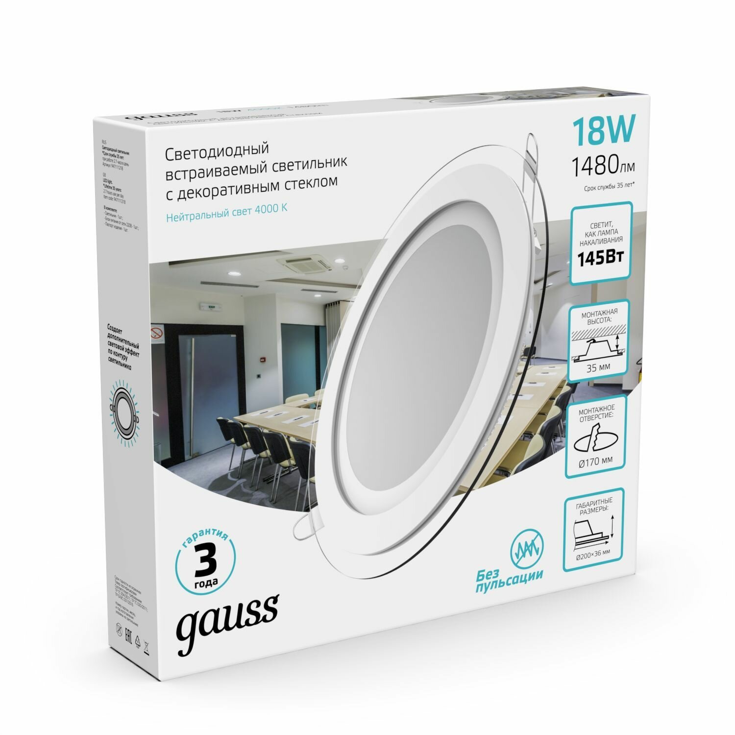 Встраиваемый светильник Gauss , круглый с декоративным стеклом, 18W 4000K