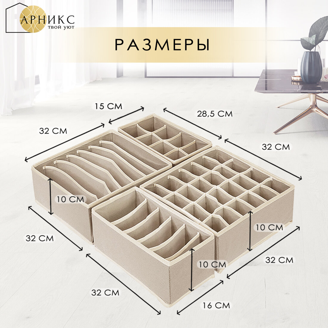 Органайзер Арникс для хранения вещей и одежды, складной, с разделителями/ Кофр для бюстгальтеров, нижнего белья и носков/ Набор 6 шт/ Бежевый 910 ₽