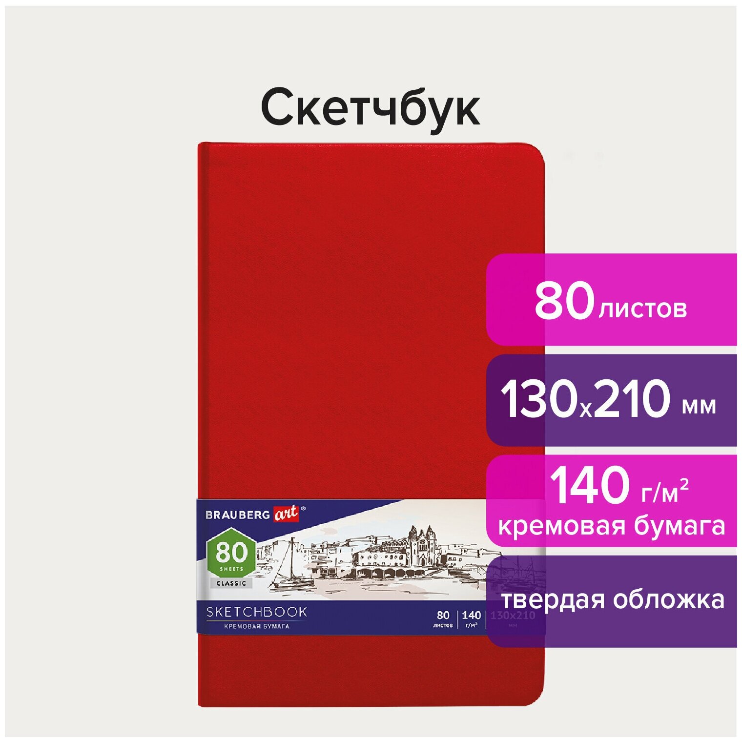 Скетчбук 140г/м 120*210 мм Brauberg ART Classic 80л, кожзам, кремовая бумага, красный 113193 Brauber .