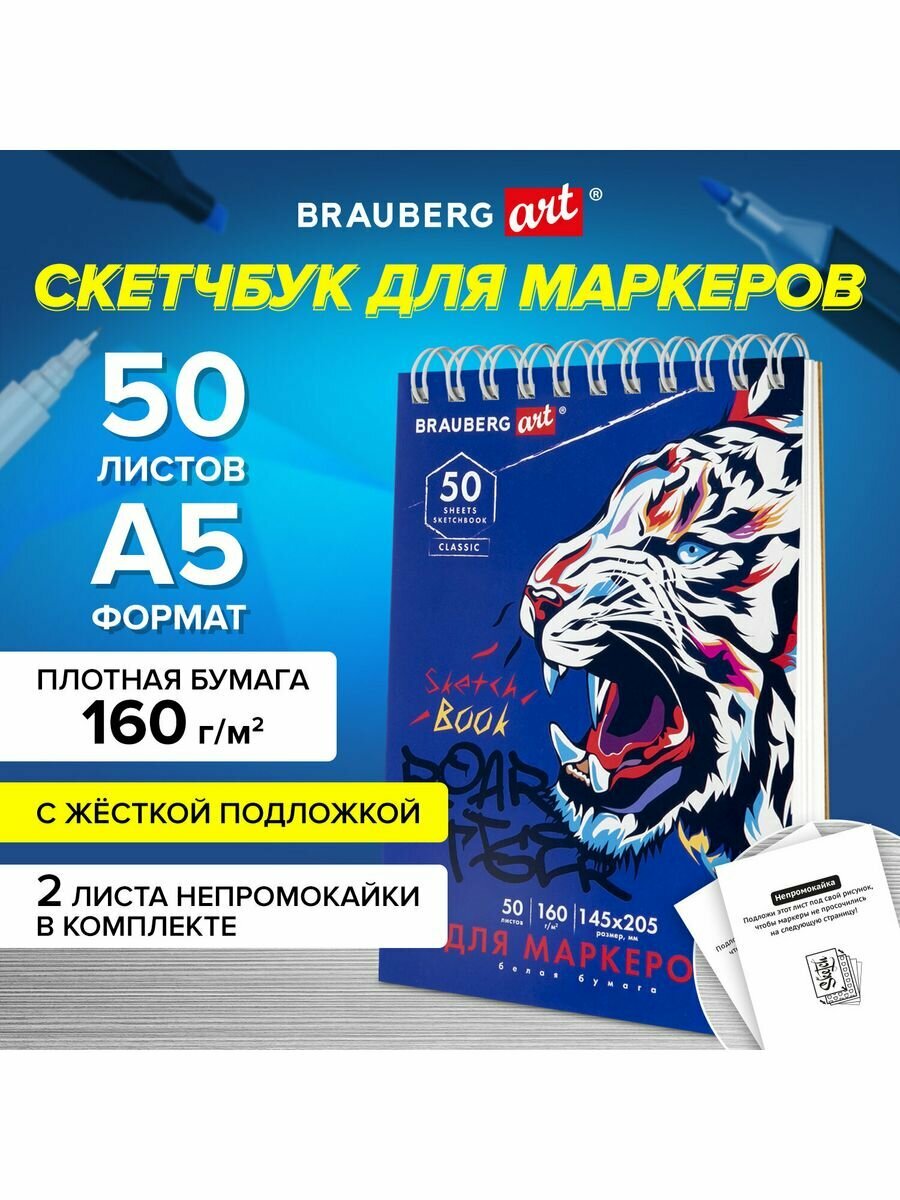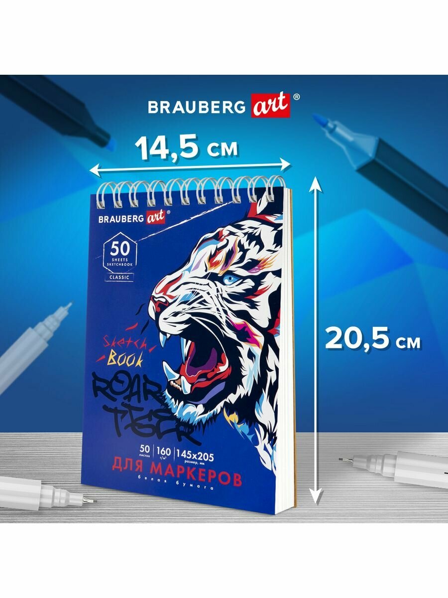 Скетчбук для маркеров, бумага 160 г/м2, 145х205 мм, 50 л., гребень, подложка, BRAUBERG ART CLASSIC, "Тигр", 115076