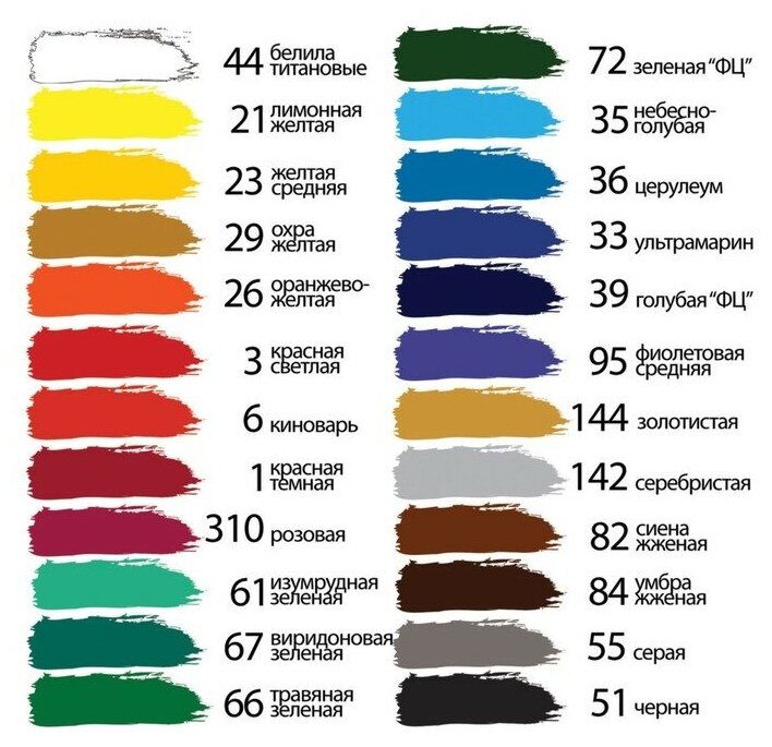 | Комплектация | в наборе 11 цветов: - белила титановые (044) - 2 шт.; - лимонная желтая (021); - оранжево-желтая (026); - красная темная (001); - церулеум (036); - голубая ФЦ (039); - зеленая светлая (062); - охра желтая (029); - сиена жженая (082); - умбра жженая (084); - черная (051) |