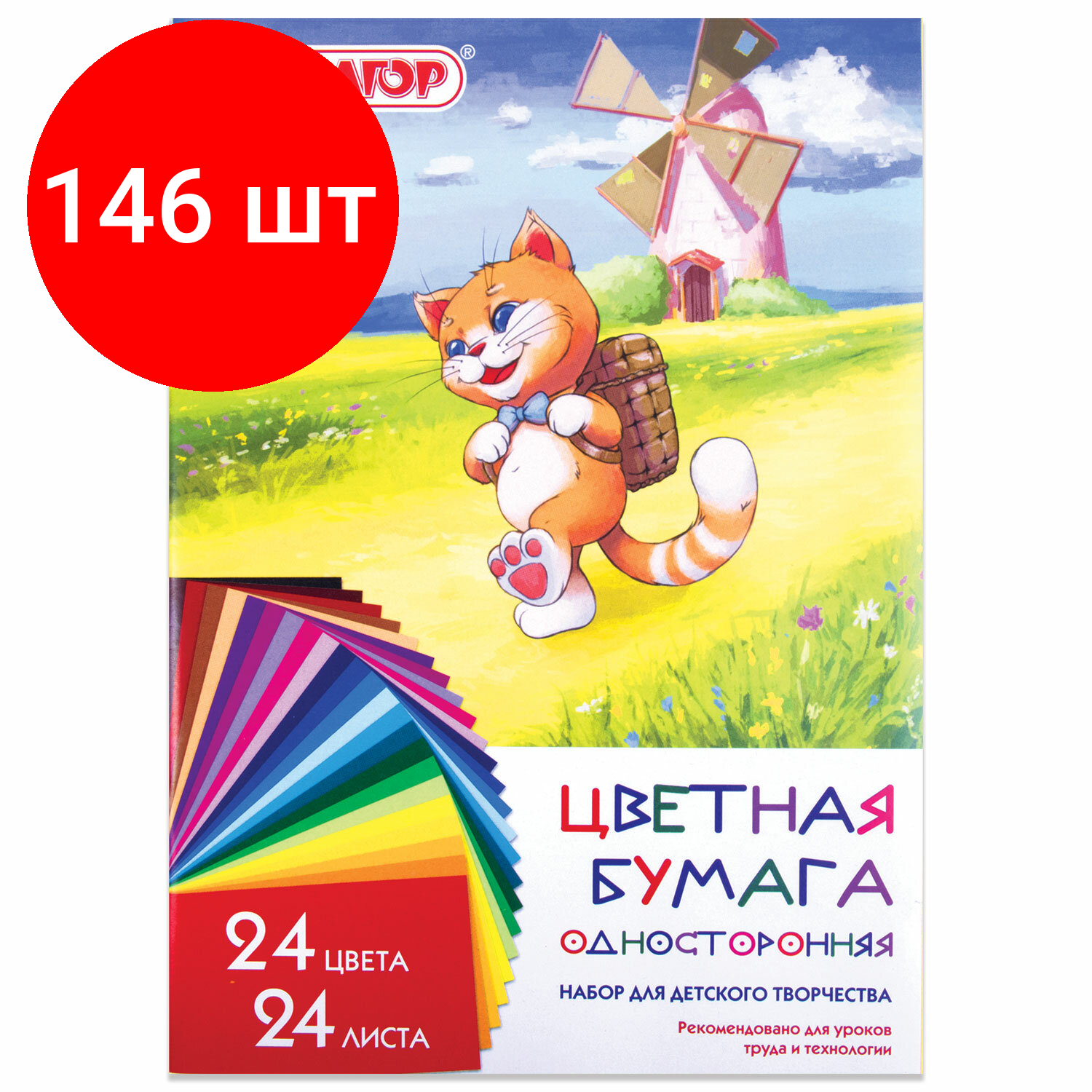 10 цен на Комплект 146 шт, Цветная бумага А4 газетная, 24 листа 24 цвета, на скобе, пифагор, 200х283 мм, "Умный котик", 128002