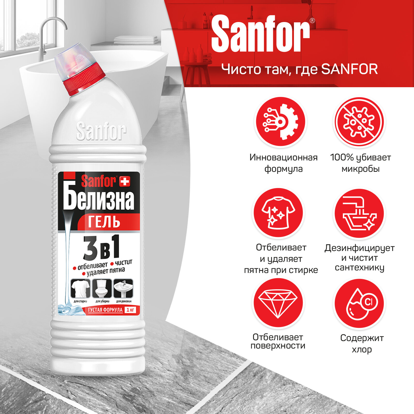 Отзывы на Чистящее средство Sanfor белизна гель, универсальное, отбеливающее, 1 л