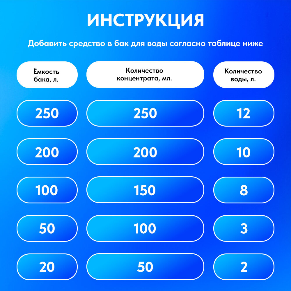 | Дополнительная информация | дозировка: 50 мл на 20 л объема бака |