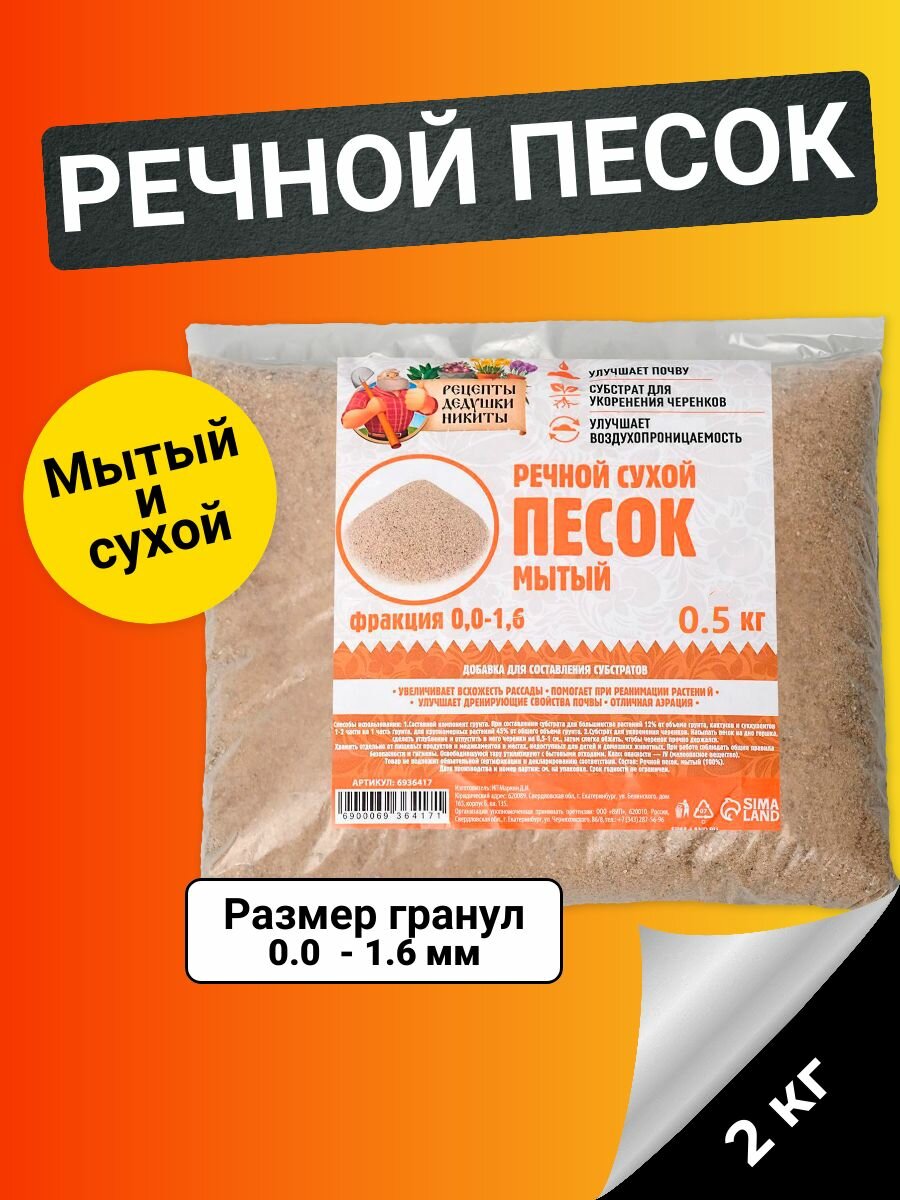 Дренаж Речной песок "Рецепты дедушки Никиты", сухой, фр 0,0-1,6, 0,5 кг информация: