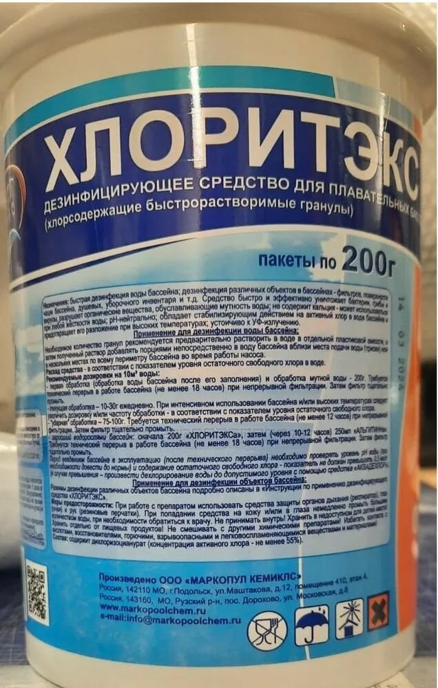 | Дополнительная информация | рекомендуемые дозировки: - текущая обработка: 50мл (открытый бассейн) и 30мл (закрытый бассейн) на 10м3 воды каждые 5-7 дней. - «ударная» обработка: 150мл на 10м3 воды – по мере необходимости. Требуется технический перерыв в работе бассейна не менее 12 часов; заросший водорослями бассейн: на 10м³ воды - сначала 10таблеток ХЛОРИТЭКСа , затем (лучше - через 10-12 часов) 250мл АЛЬГИТИННа |