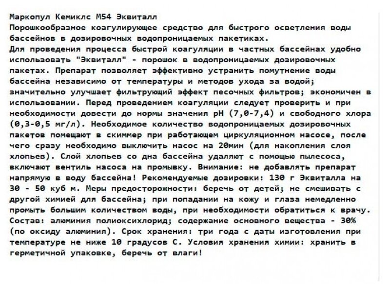 Химия для бассейна - Коагулянт: "Эквиталл" (0,8 кг) Гранулы / порошок, Препарат для осветления и очистки воды / Средство для ухода за водой "Маркопул Кемиклс"
