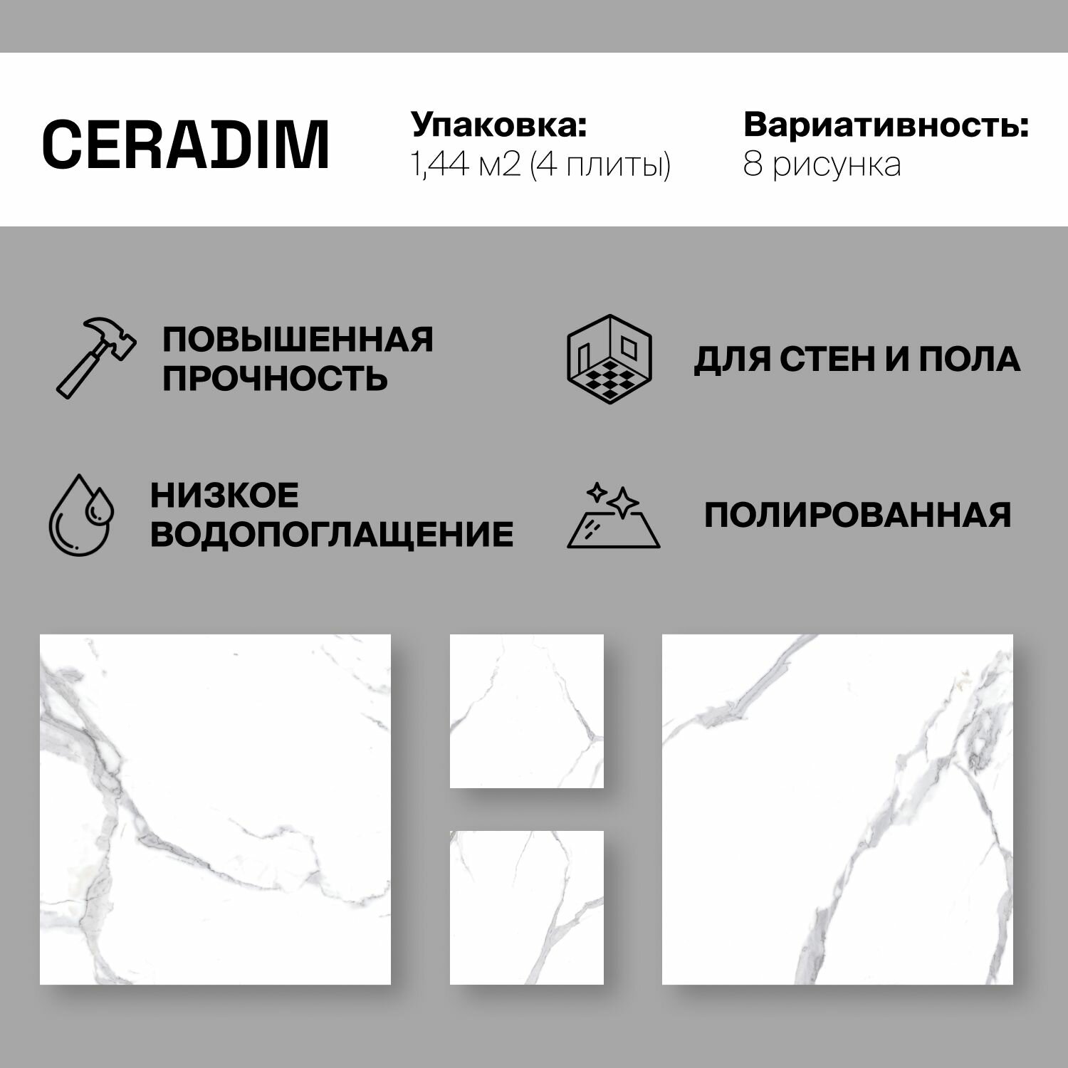 Керамогранит Ceradim Statuario Wonderful белый 60х60 Полированный в упаковке 1,44м2 (4 плиты) 7 004 ₽
