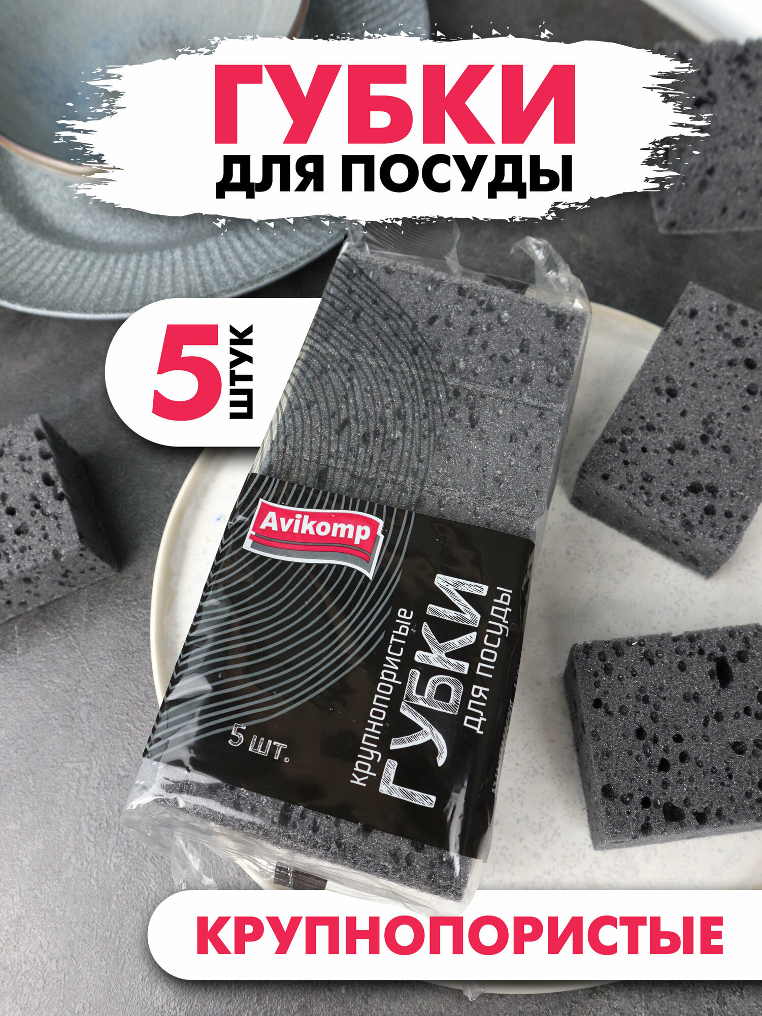 Губка для посуды крупнопористая графит, Avikomp, 95х65х40 мм, 5 шт.