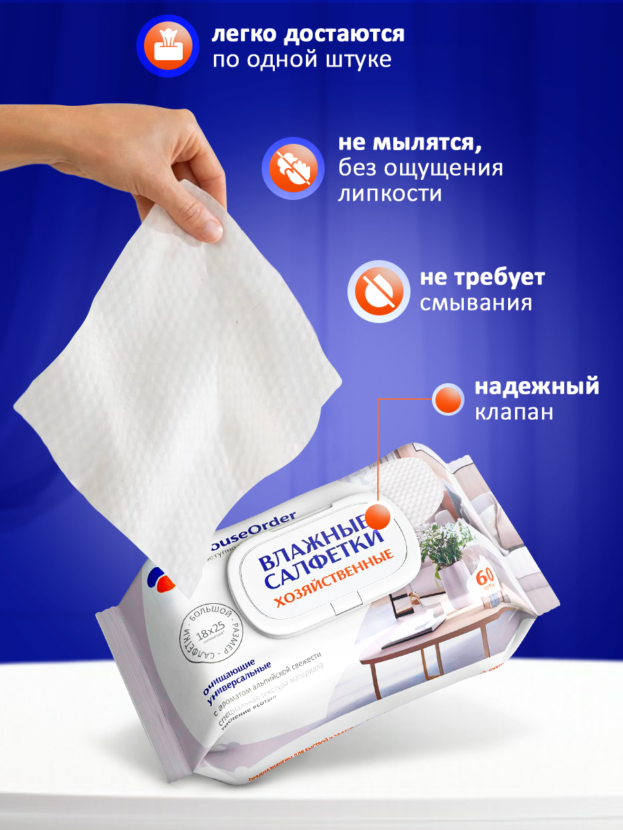 Влажные салфетки для уборки дома HouseOrder, хозяйственные, 60 штук информация: