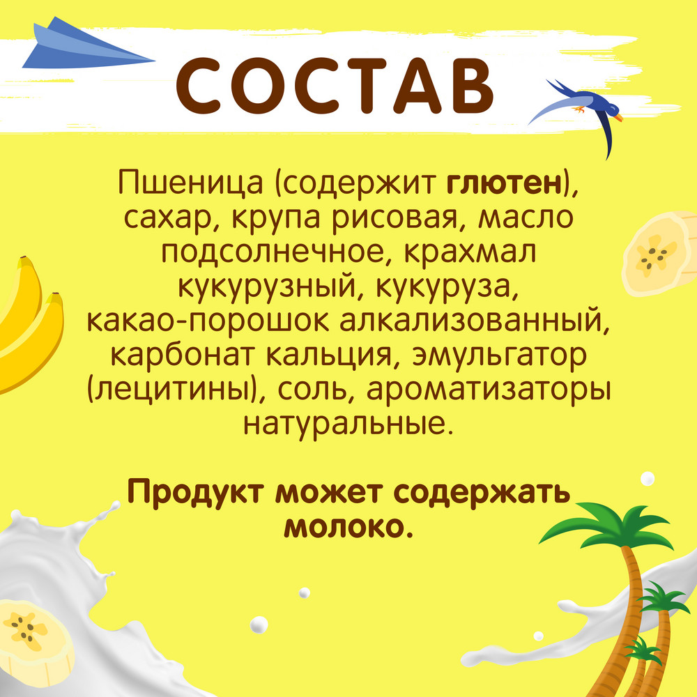 | Состав | пшеница (содержит глютен) / сахар / крупа кукурузная / пшеничная мука (содержит глютен) / Рисовая крупа / патока / масло подсолнечное / какао-порошок алкализованный / карбонат кальция / молоко сухое обезжиренное / соль / эмульгатор (лецитины) / ароматизаторы натуральные / карамельный сироп |
