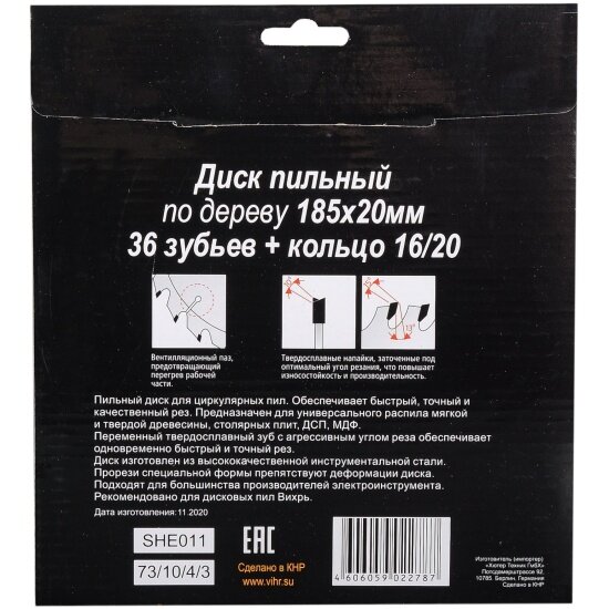 Пильный диск по дереву Вихрь 185х20 мм, 36 зубьев+кольцо 16/20, 73/10/4/3 информация: