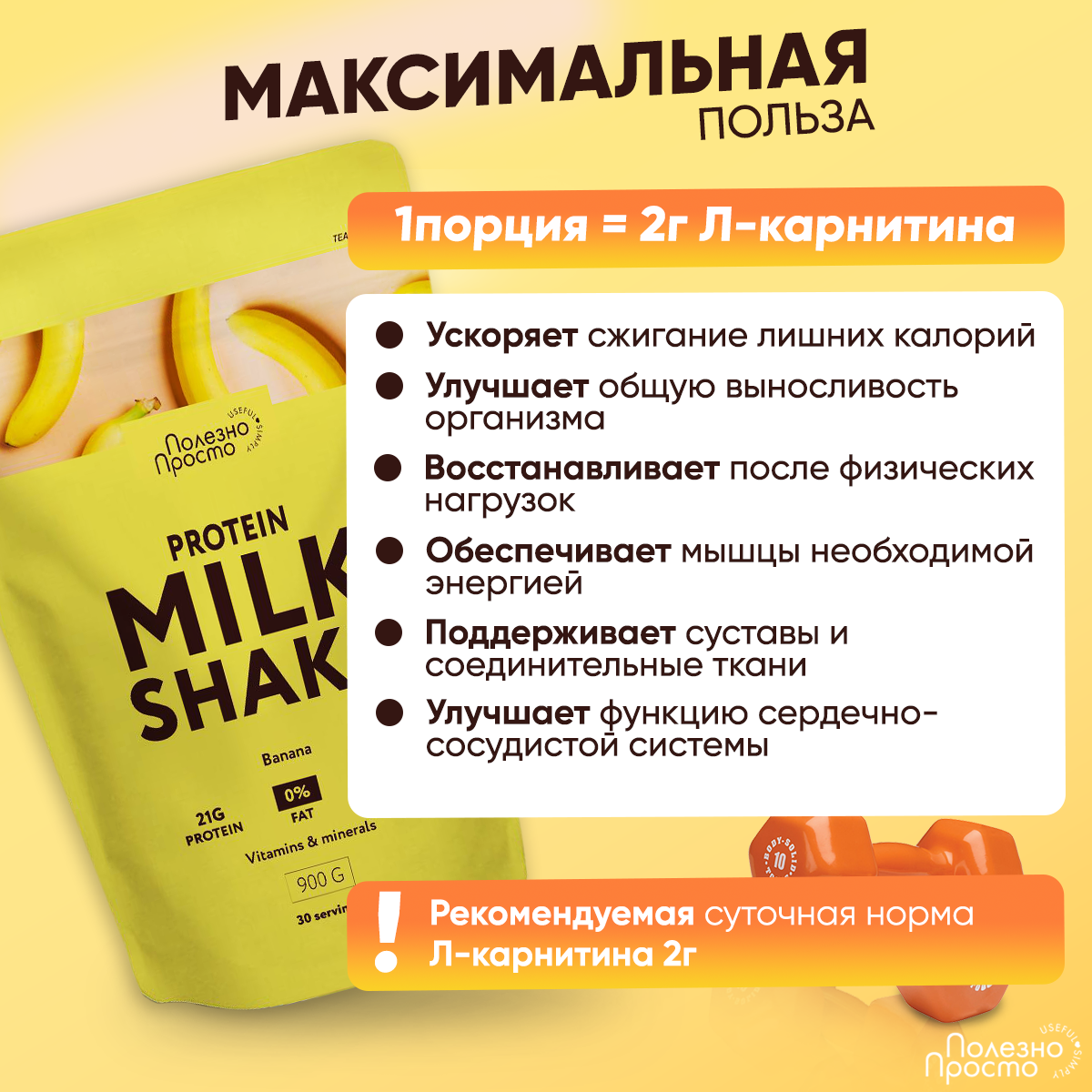 Протеиновый коктейль для похудения, Полезно Просто, молочный коктейль, без сахара с л карнитином, вкус банан, 900 гр. информация: