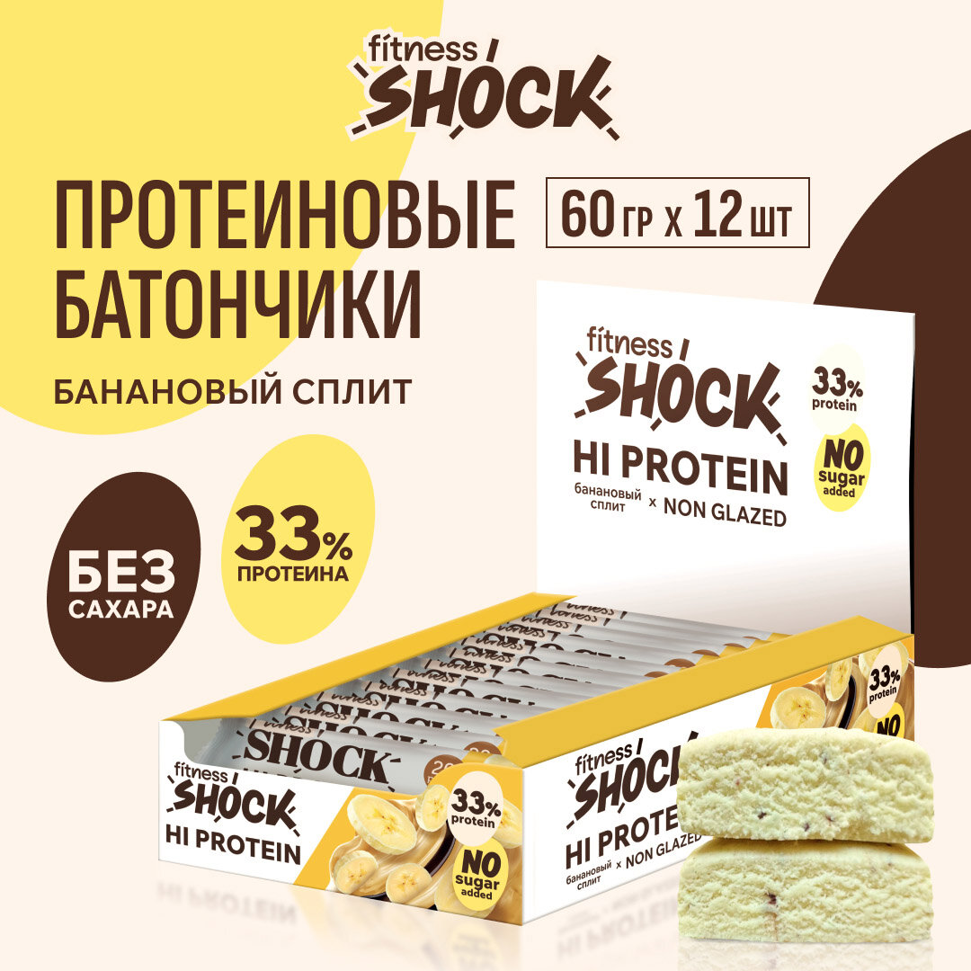 10 цен на Протеиновые батончики без сахара "Банановый сплит" FitnesSHOCK 60 гр, 12 шт