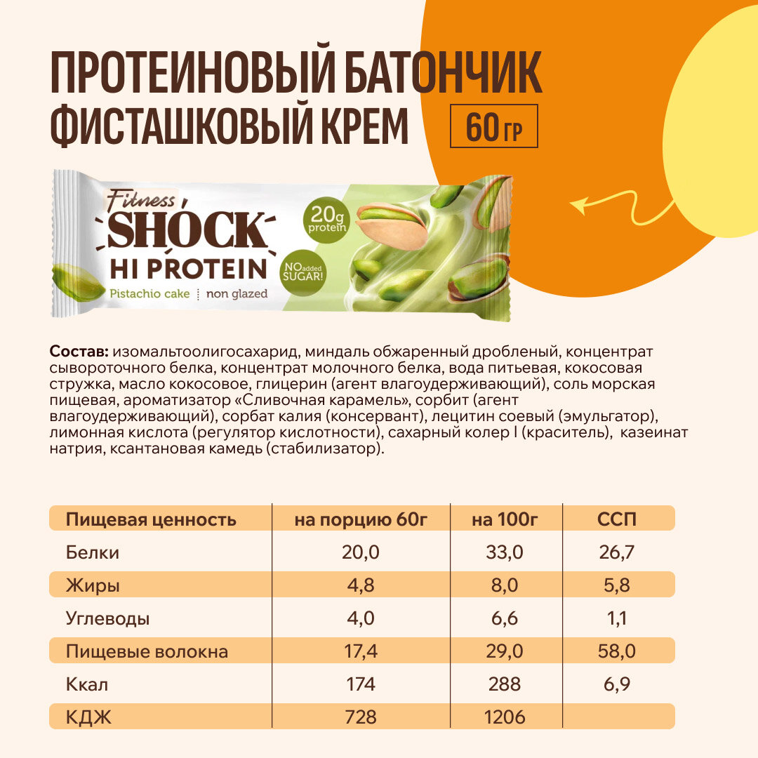 10 цен на Протеиновые батончики без сахара неглазированные "Фисташковый десерт" FitnesSHOCK 60гр, 12шт