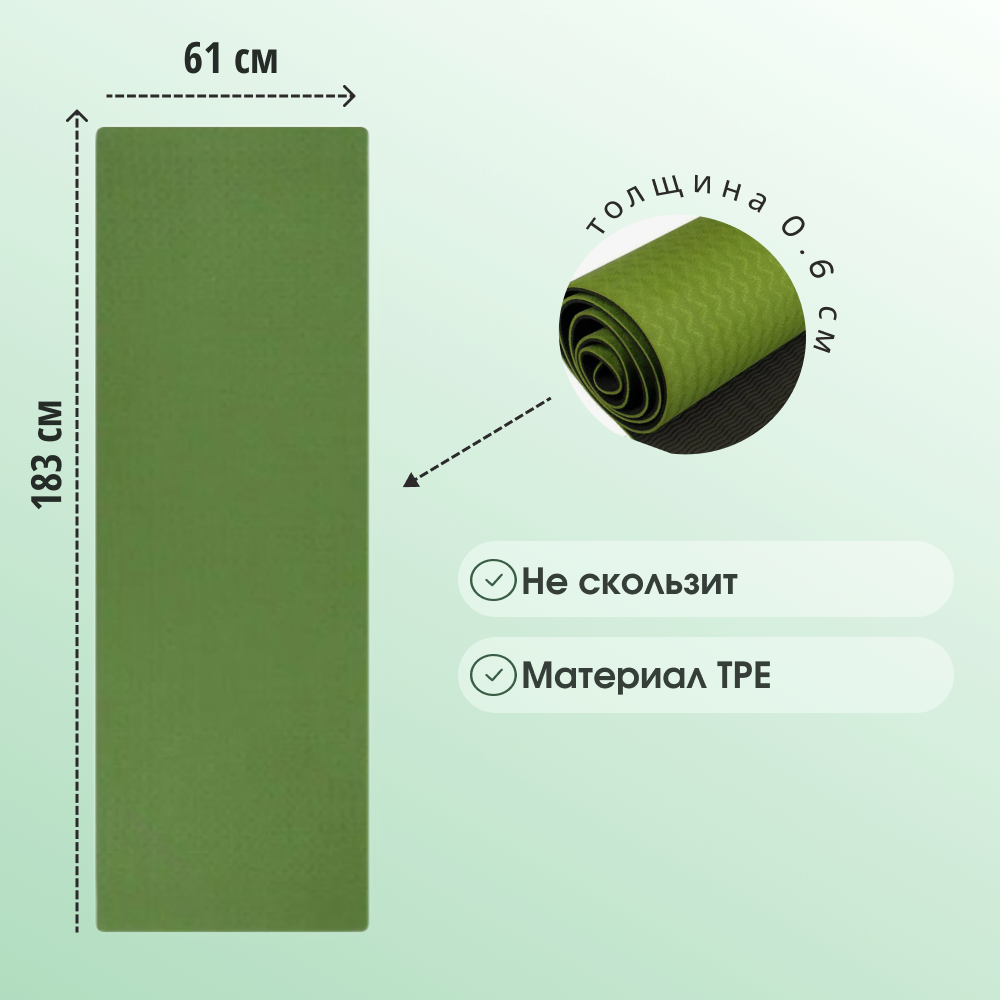 Коврик для йоги и фитнеса Yoga Island, нескользящий, ТПЕ, 0.6 см, 183×61 см, хаки информация:
