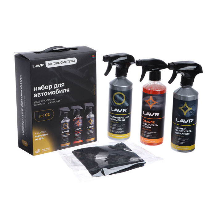 | Состав | Ln1475 Чернитель шин глянцевый, 500 млLn1610 Очиститель стекол ORANGE, 500 млLn1508 Пенный очиститель двигателя, 500 млСалфетка из микрофибры 30х40 см черная |