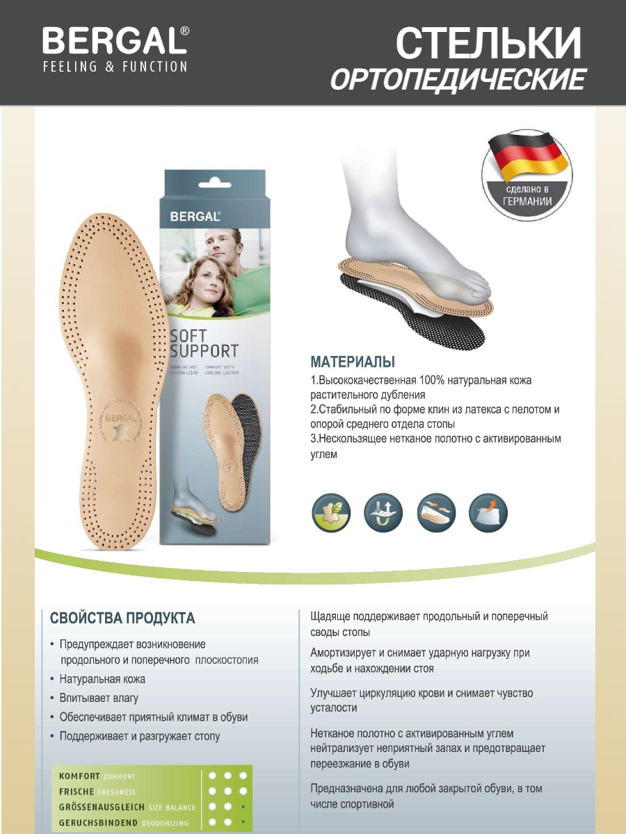 Стельки BERGAL SOFT SUPPORT размер 42 для предотвращения плоскостопия, анатомические кожа бескаркасные информация: