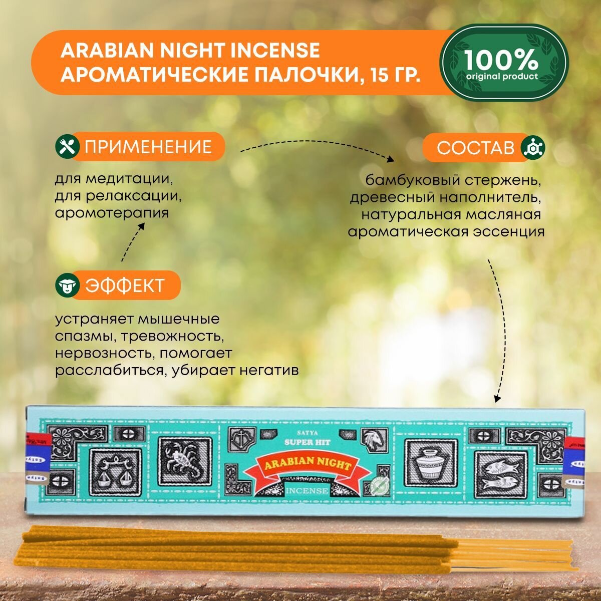 Благовония Super Hit Arabian Night Incense (Супер Хит Арабская ночь) Ароматические индийские палочки для дома, йоги и медитации, Satya (Сатья), 15г информация: