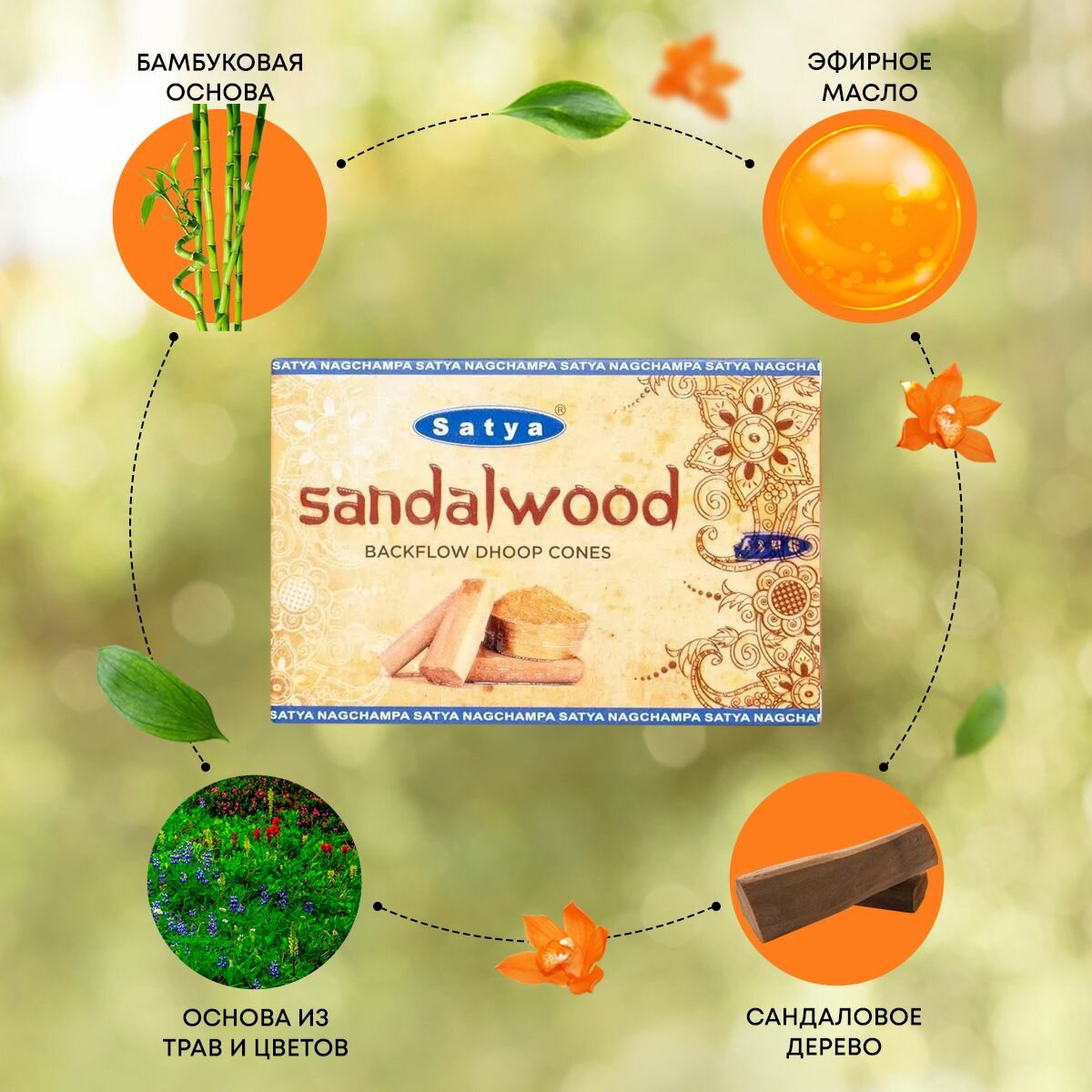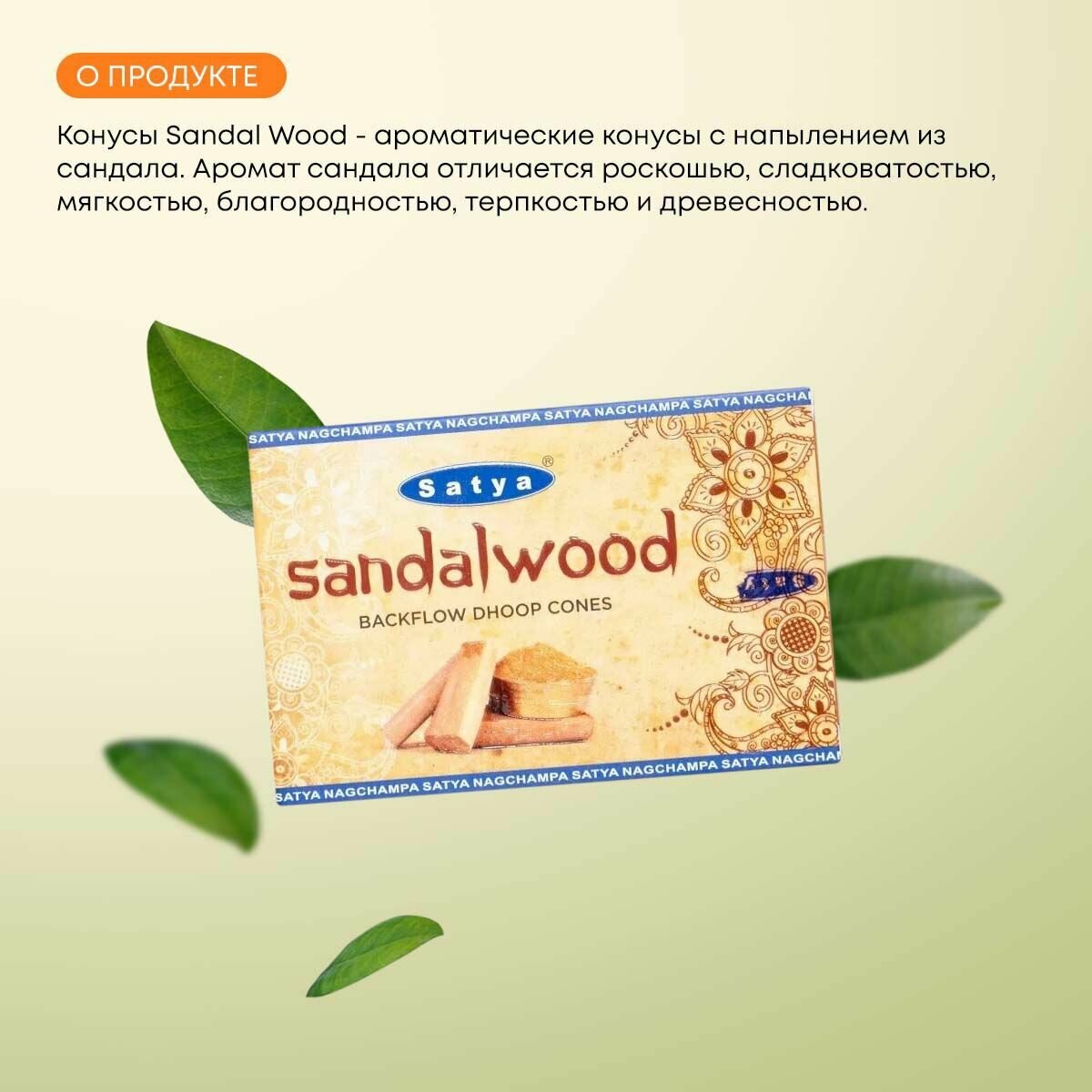 Благовония Sandal Wood (Сандаловое дерево) Ароматические индийские конусы для дома, йоги и медитации, Satya Premium (Сатья Премиум), 10шт. информация: