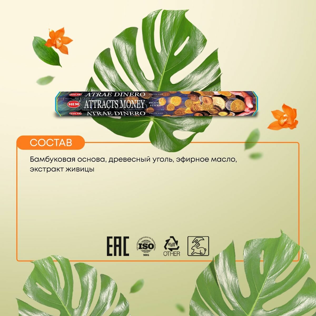 Благовония Индийские ароматические палочки для дома, йоги и ароматерапии для привлечения денег (Attracts money incense sticks) HEM ХЭМ, 20шт информация: