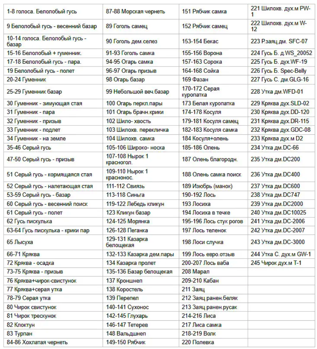 | Имитация звука | бекас / вальдшнеп / волк / ворона / глухарь / гусь / заяц / изюбрь / кабан / коростель / косуля / куропатка / лиса / лось / олень / перепелка / рябчик / сорока / тетерев / утка / фазан |