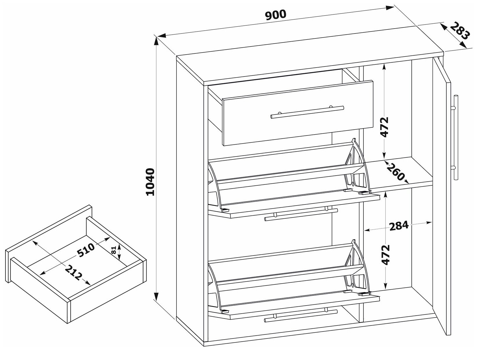 | Комплектация | 1 полка, 1 ящик, 2 полки для обуви, 3 дверцы |