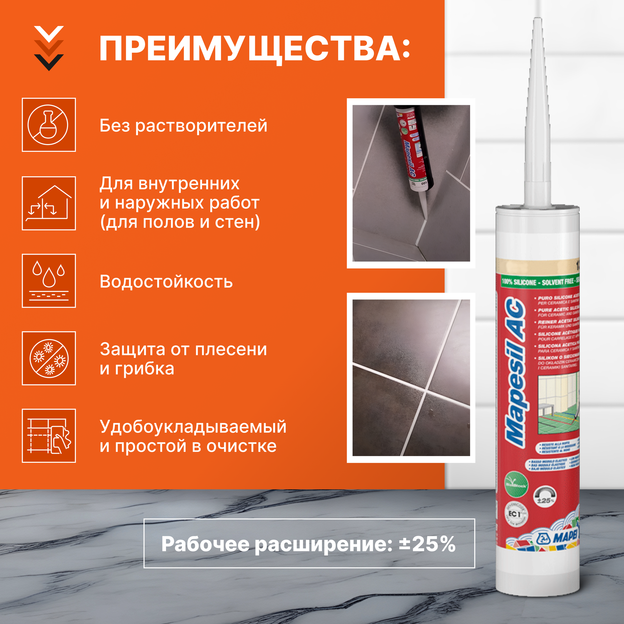 Герметик силиконовый Mapei Mapesil AC №134 шелк, 310 мл / герметик силиконовый для ванной, для кухни 2 317 ₽