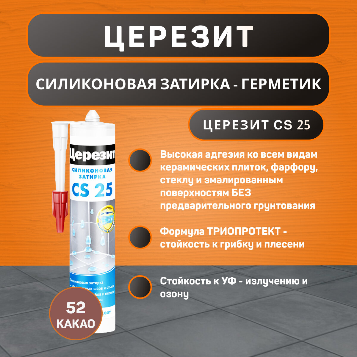 Затирка-герметик силиконовая Церезит CS 25 №52 какао 280 мл / для ванной, кухни 976 ₽