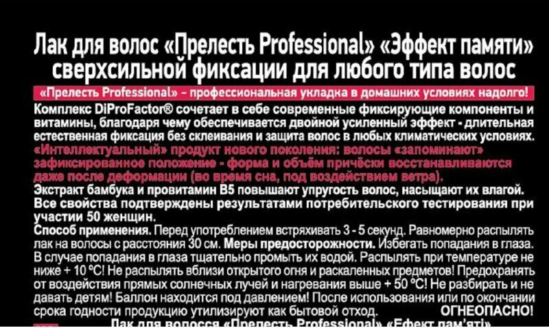 | Дополнительная информация | Прелесть Professional Лак для волос Эффект памяти, экстрасильная фиксация, 300 мл |