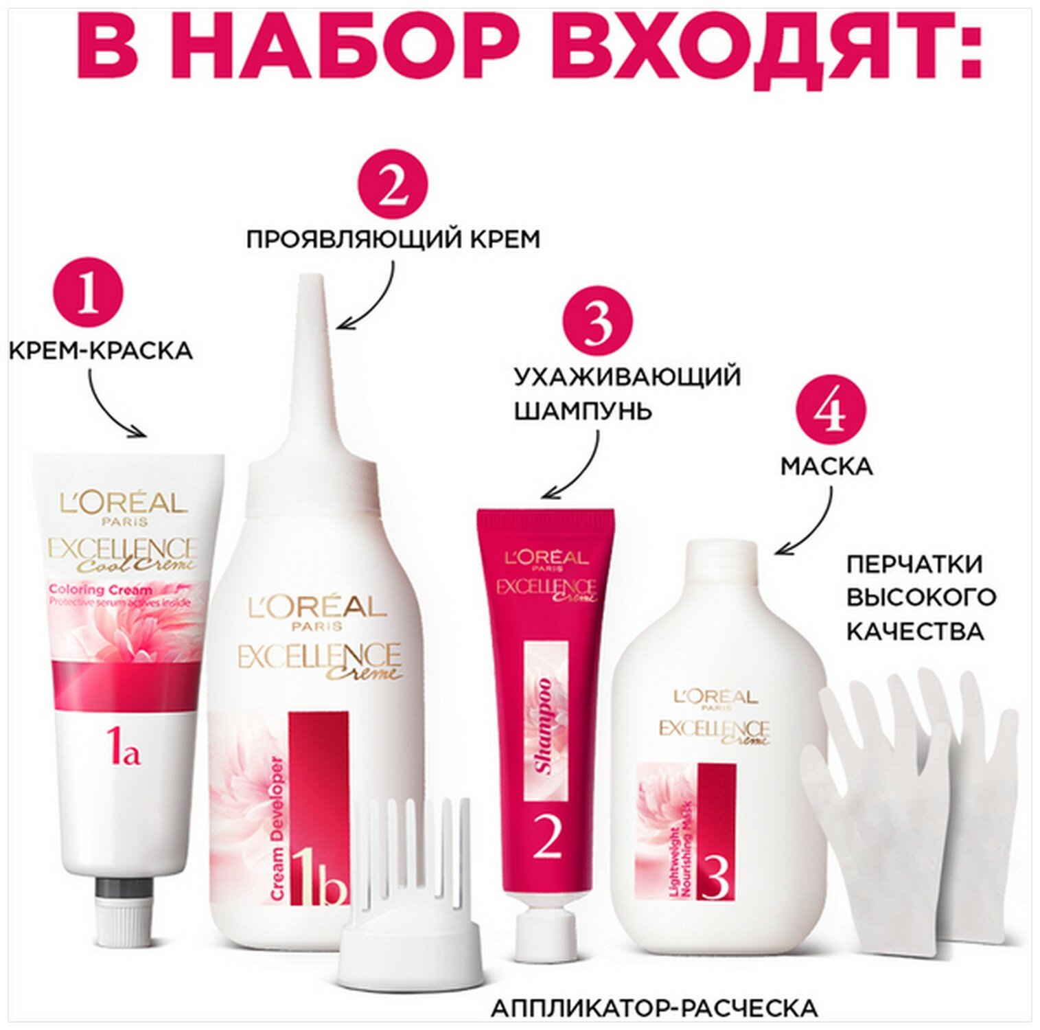 | Комплектация | - защищающая сыворотка (12 мл),- флакон-аппликатор с проявителем (72 мл),- тюбик с красящим кремом (48 мл),- флакон с бальзамом-уходом (60 мл),- аппликатор-расчёска,- инструкция,- пара перчаток |