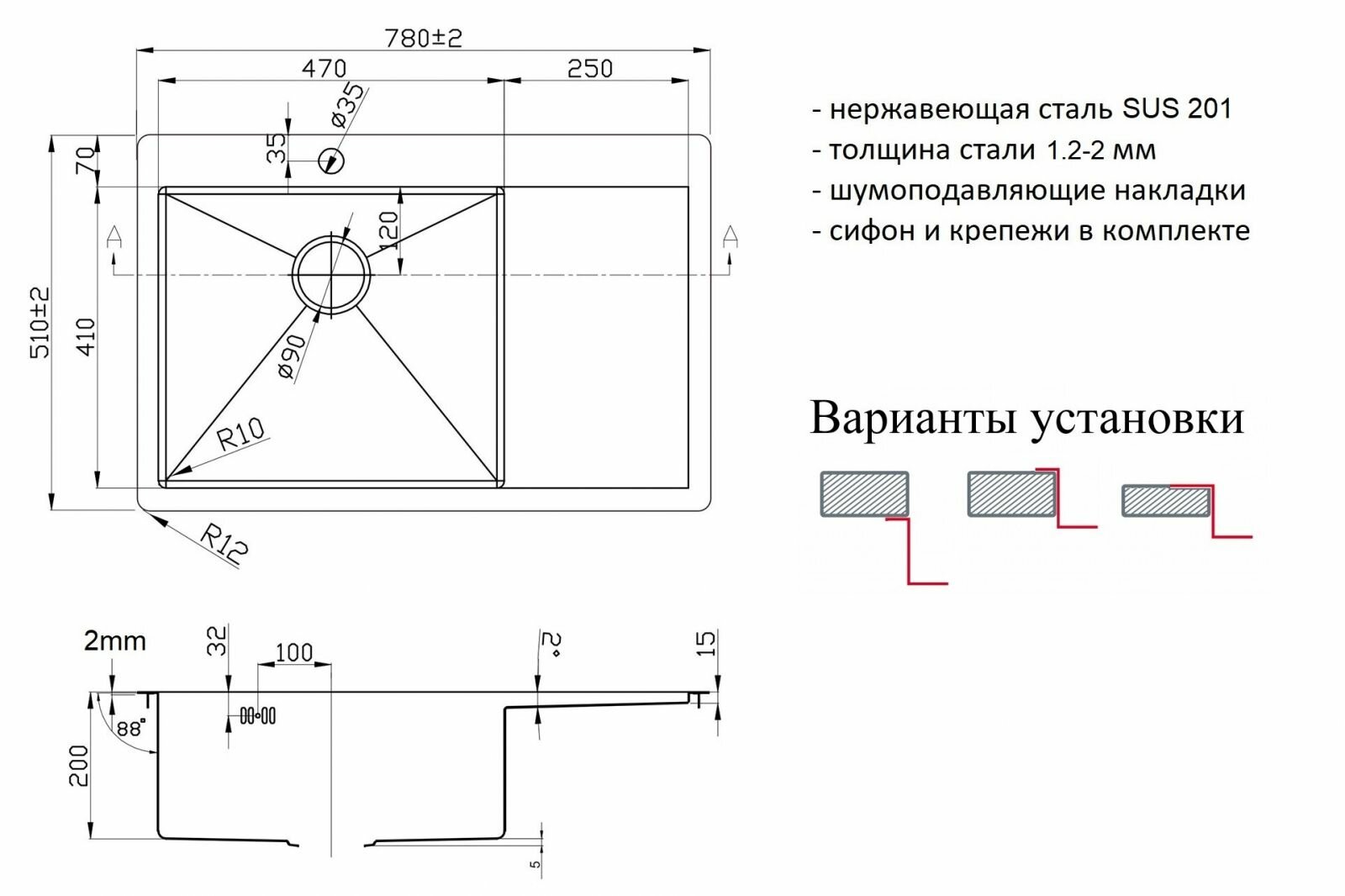 Кухонная мойка Zorg ZL R 780510-L чаша слева, крыло справа, нержавеющая сталь, брашинг матовая, сварная, толщина 1,2 мм 31 400 ₽