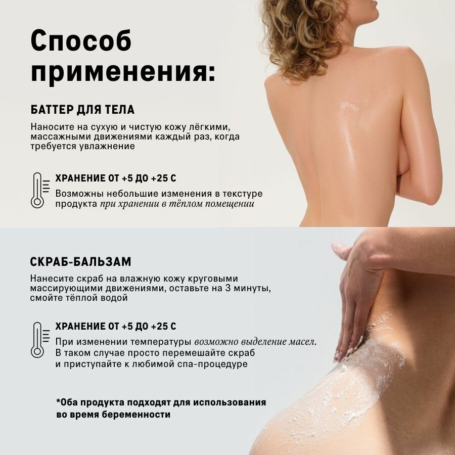 | Способ применения | Нанесите скраб на влажную кожу рук, ног и тела круговыми массирующими движениями. Включите воду в душе и продолжайте втирать скраб, пока он полностью не смоется. Если вы предпочитаете принимать ванну, нанесите скраб и оставьте на три минуты до того, как вы сядете в воду. Рекомендуем использовать 2-3 раза в неделю для эффективного результата. Храните закрытым при температуре от +5 до 25С. |