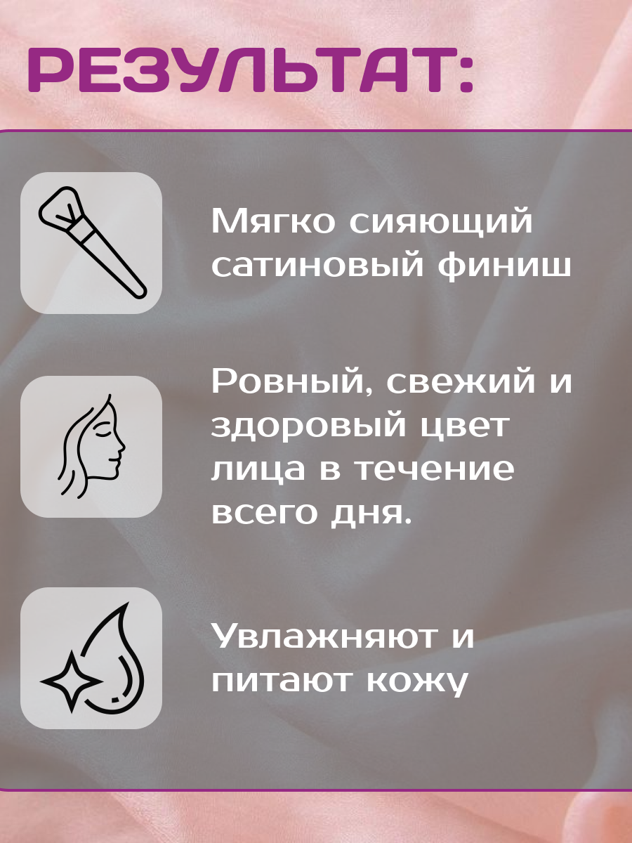 | Эффект | выравнивание поверхности кожи / защита от солнца / лифтинг / маскировка несовершенств / омоложение / питание / разглаживание морщин / тонирование / увлажнение / улучшение цвета |