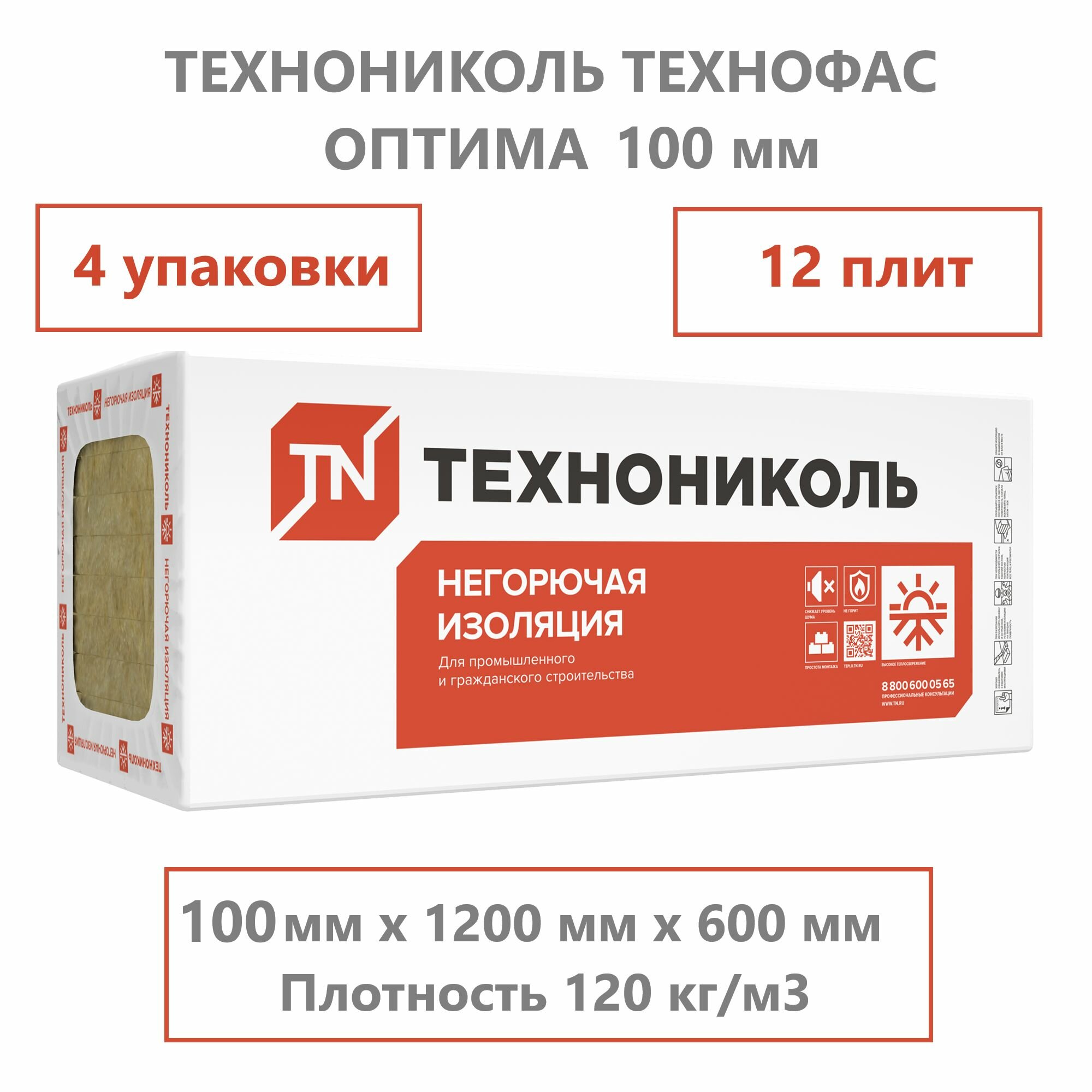 Технофас оптима 100 мм (4 упаковки; 12 плит; 8,64 м2), Минеральная вата технониколь, Плотность 120 кг/м3 информация: