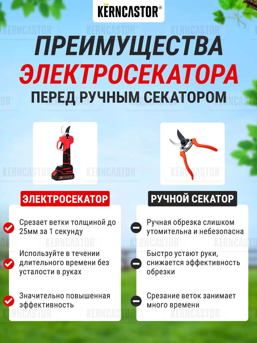 Отзывы на Аккумуляторный секатор садовый мощный профессиональный 2 аккумулятора KERNCASTOR