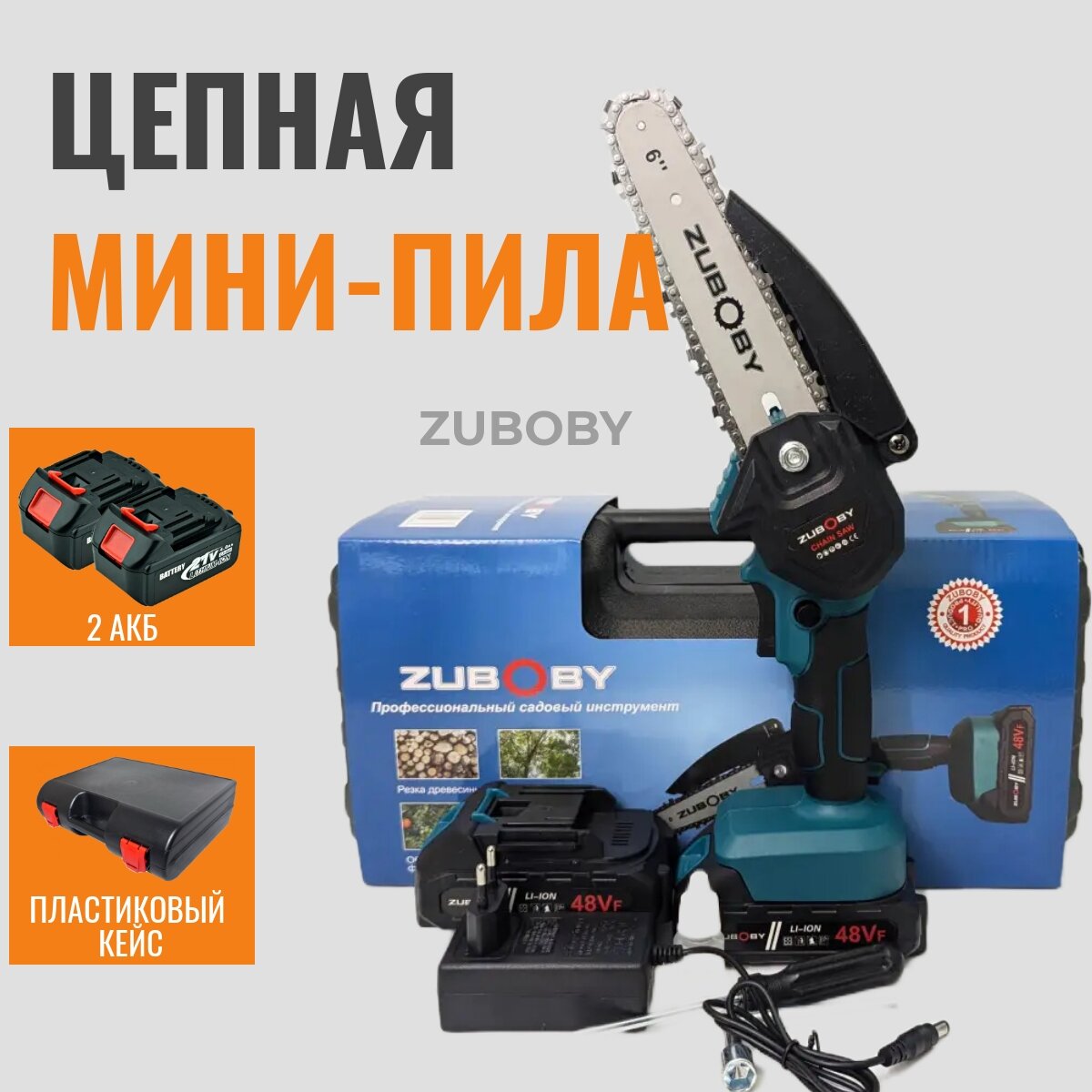 Аккумуляторная мини-пила (бесщеточный двигатель, 2 акк. 21В, 1,5Ач Li-Ion, шина 6", праймер смазки цепи, подсветка, кейс). 3 900 ₽