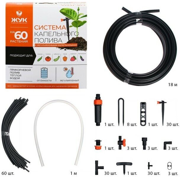 Капельный полив "Жук" №7 от емкости, 60 растений, с регулируемыми капельницами (Тепличный) информация: