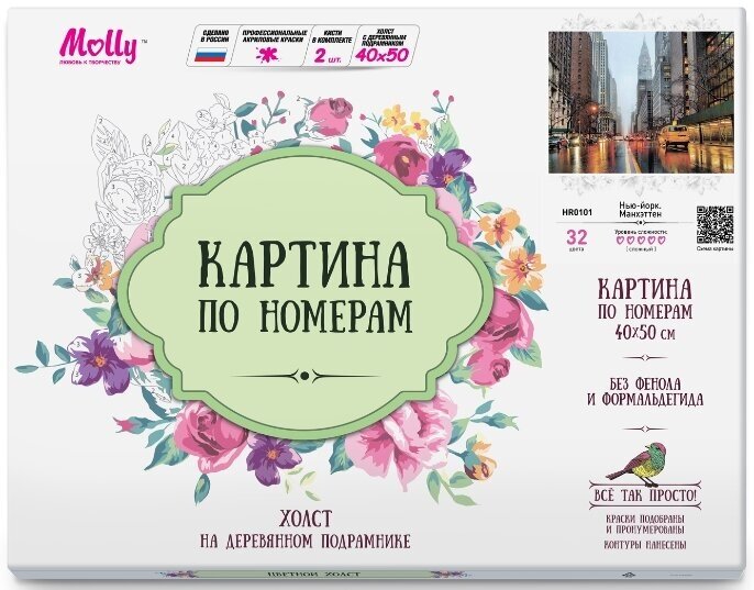 | Комплектация | прогрунтованный холст на деревянном подрамнике, фурнитура для фиксации картины на стене, 2 нейлоновые кисти разного размера, профессиональные акриловые краски, устойчивые к выцветанию, контрольный лист, можно скачать по QR-коду на упаковке. |