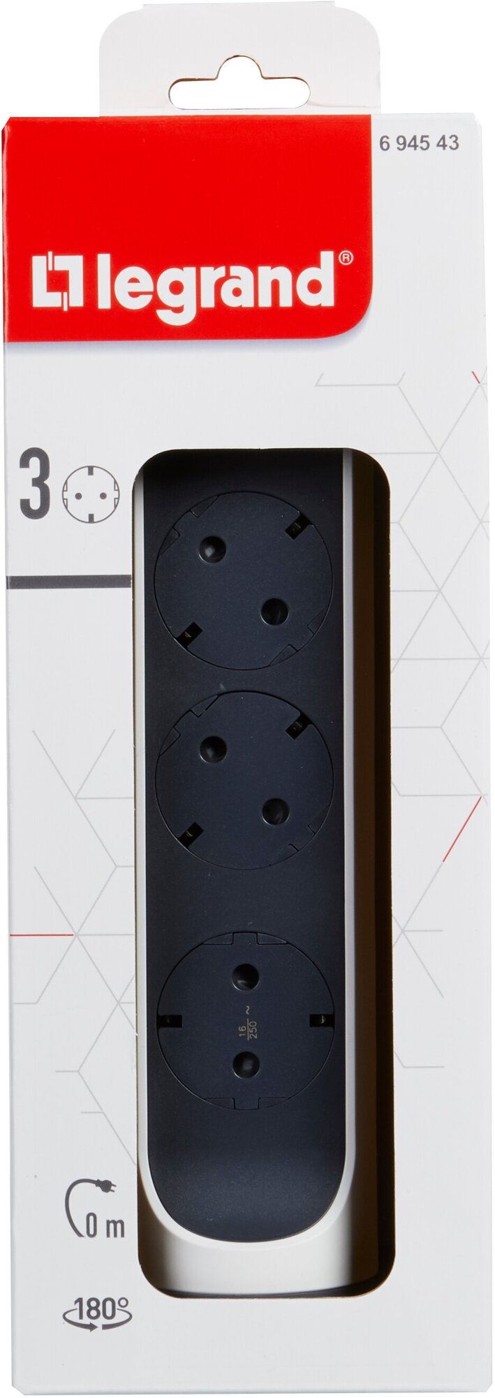 Удлинитель с заземлением Legrand 3 розетки без кабеля, с кнопкой включения и поворотным основанием, цвет: бело-черный , арт. 694543