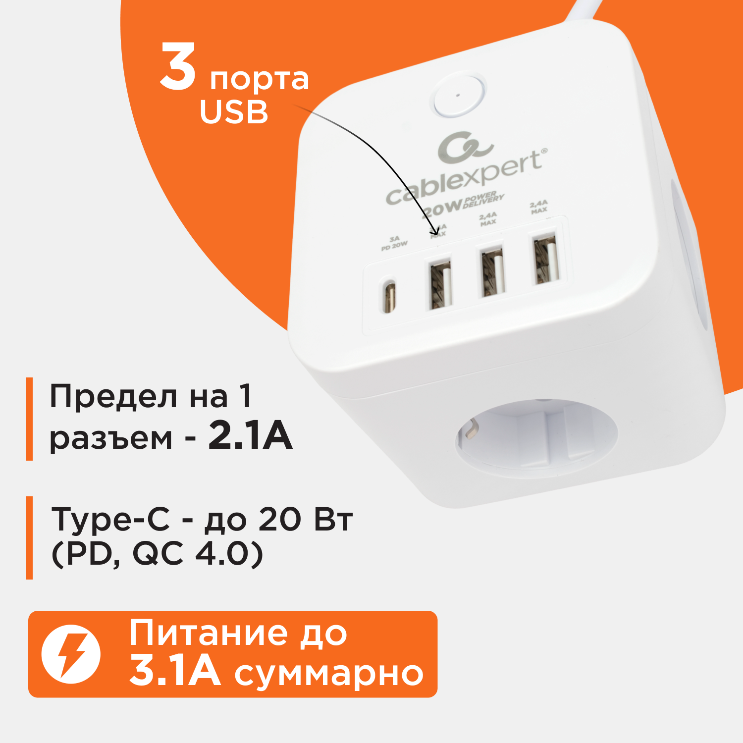 10 цен на Сетевой фильтр Cablexpert Cube белый 10А 1xType-C PD 3xUSB 1.5 метра с заземлением выключателем и защитными шторками уровень защиты 4+ CUBE-3-CU3-W-1.5