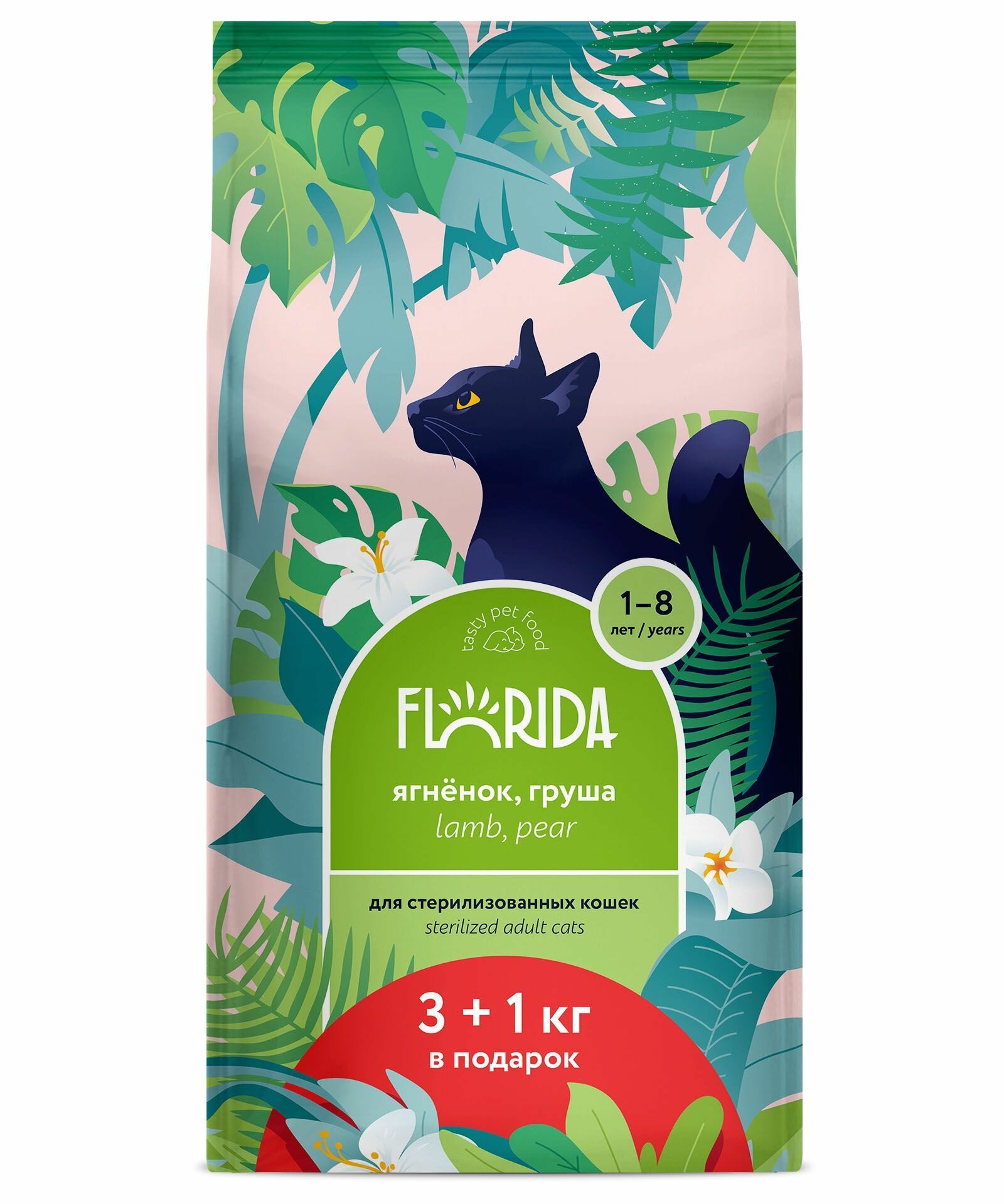 Сухой корм FLORIDA для взрослых стерилизованных кошек: ягненок с грушей 3+1кг информация: