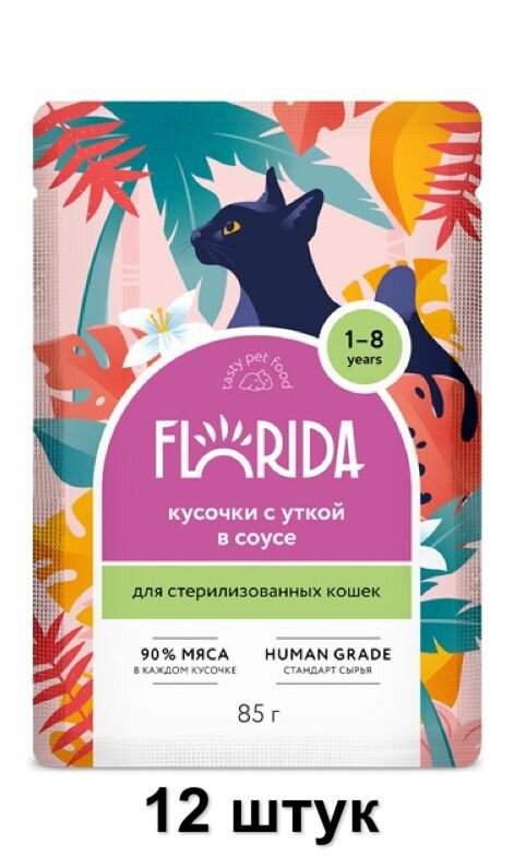 10 цен на FLORIDA (Флорида) "Упаковка 12 шт" Паучи для стерилизованных кошек: кусочки с уткой в соусе, 1 упаковка - 12 шт