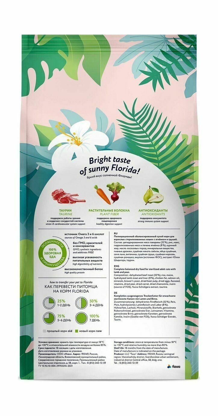 FLORIDA для взрослых кастрированных котов и стерилизованных кошек с ягненком и грушей NEW 0,8 кг х 8 шт 8 903 ₽