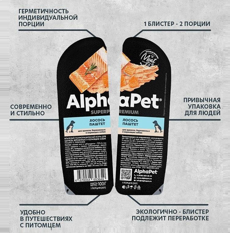 Влажный полнорационный корм для щенков, беременных и кормящих собак AlphaPet Superpremium, паштет с лососем, 100г * 15шт 1 470 ₽