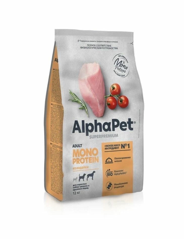 Сухой корм AlphaPet Superpremium Monoprotein АльфаПет для собак Средних и Крупных пород Индейка, 12 кг информация: