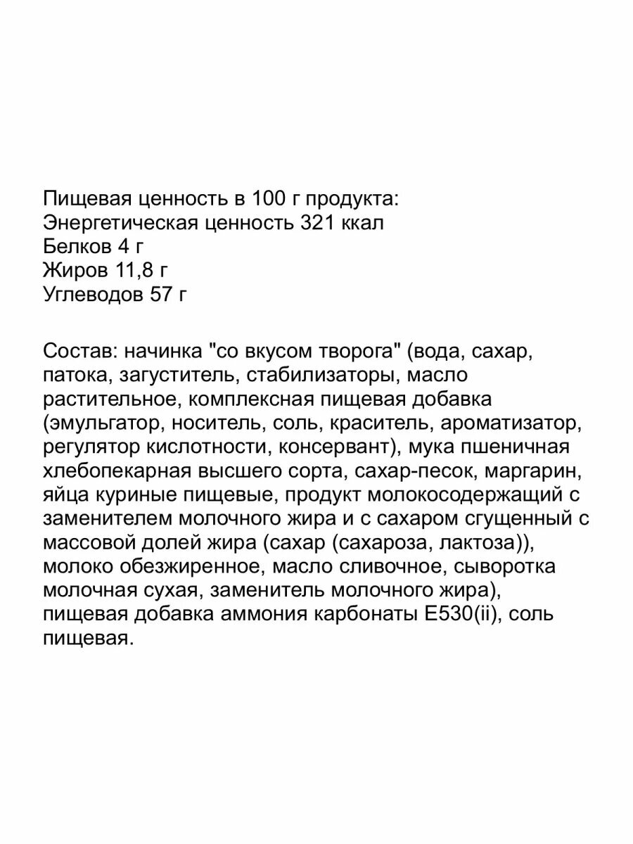 | Состав | начинка "со вкусом творога" (вода, сахар, патока, загуститель, стабилизаторы, масло растительное, комплексная пищевая добавка (эмульгатор, носитель, соль, краситель, ароматизатор, регулятор кислотности, консервант), мука пшеничная хлебопекарная высшего сорта, сахар-песок, маргарин, яйца куриные пищевые, продукт молокосодержащий с заменителем молочного жира и с сахаром сгущенный с массовой долей жира (сахар (сахароза, лактоза)), молоко обезжиренное, масло сливочное, сыворотка молочная сухая, заменитель молочного жира), пищевая добавка аммония карбонаты Е530(й), соль пищевая. |
